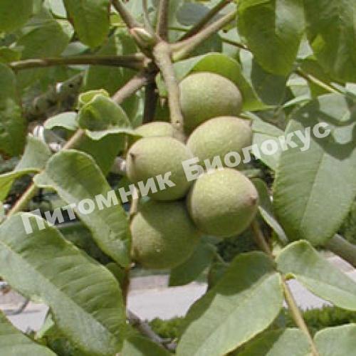 Особого внимания здесь заслуживают плоды. Они неплохого качества, крупные. По весу один орех может достигать 19 грамм. Круглая форма плодов имеет слабо выраженную ребристость. Толщина у скорлупы средняя, но плотная. Внутри находится большое ядро, маслянистое, довольно приятное на вкус. В составе находится примерно 68-70 процентов жира.